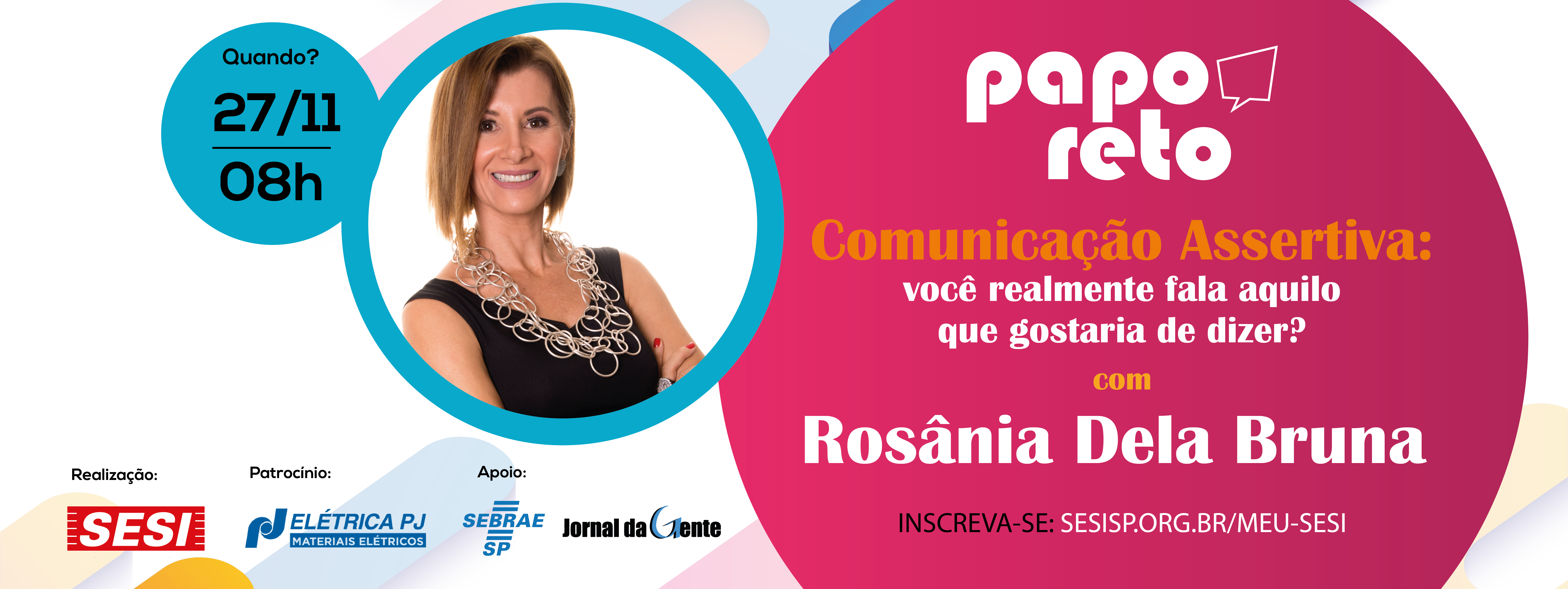 O Papo Reto do mês de novembro traz a convidada Rosânia Dela Bruna, coach de vida, carreira e comunicação que abordará como assunto principal as formas de se ter uma comunicação mais assertiva. O encontro acontece no dia 27 de novembro, a partir das 8h da manhã, com um coffee de abertura seguido do bate-papo. A Entrada é gratuita e as inscrições podem ser feitas pelo sistema Meu SESI.